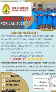 Mutolere School of Nursing and midwifery, a leading institution in nursing and midwifery education, invites applications from qualified candidates for our Diploma in Nursing and midwifery extension programs. These courses are designed to equip students with the knowledge, skills, and expertise needed to excel in the nursing and midwifery profession.